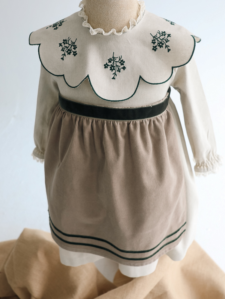 01 VESTIDO CORTO DELANTAL coton tostado m/l rematado puntillita