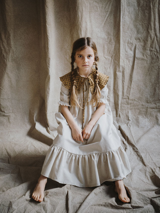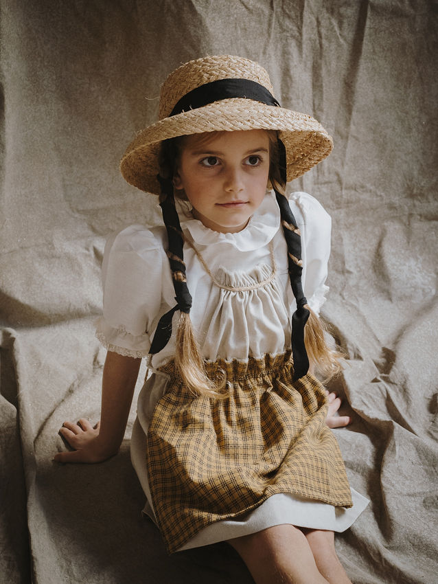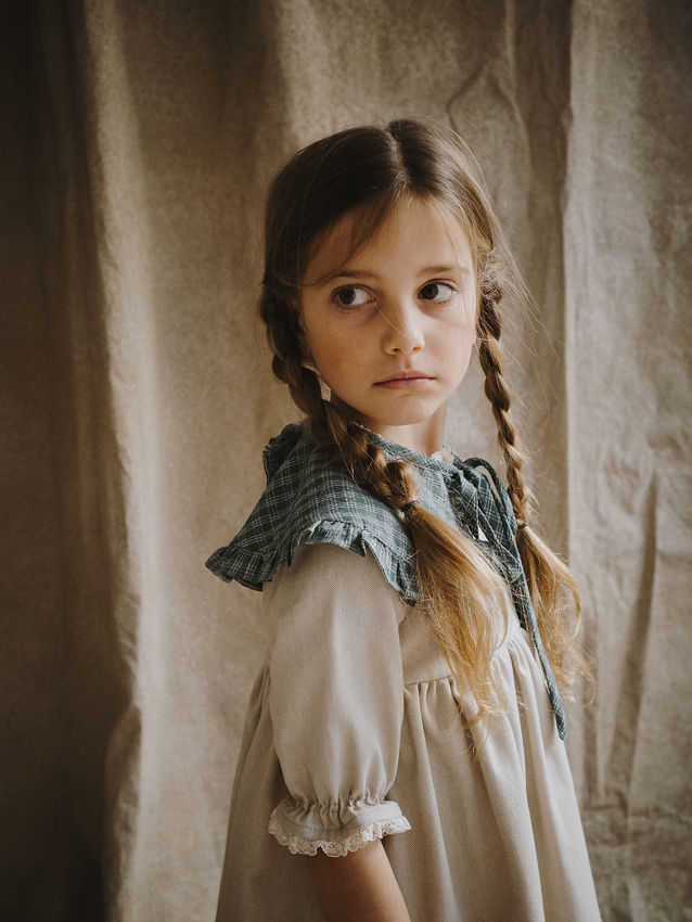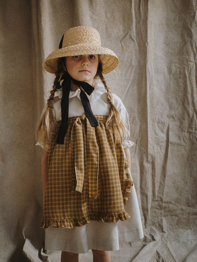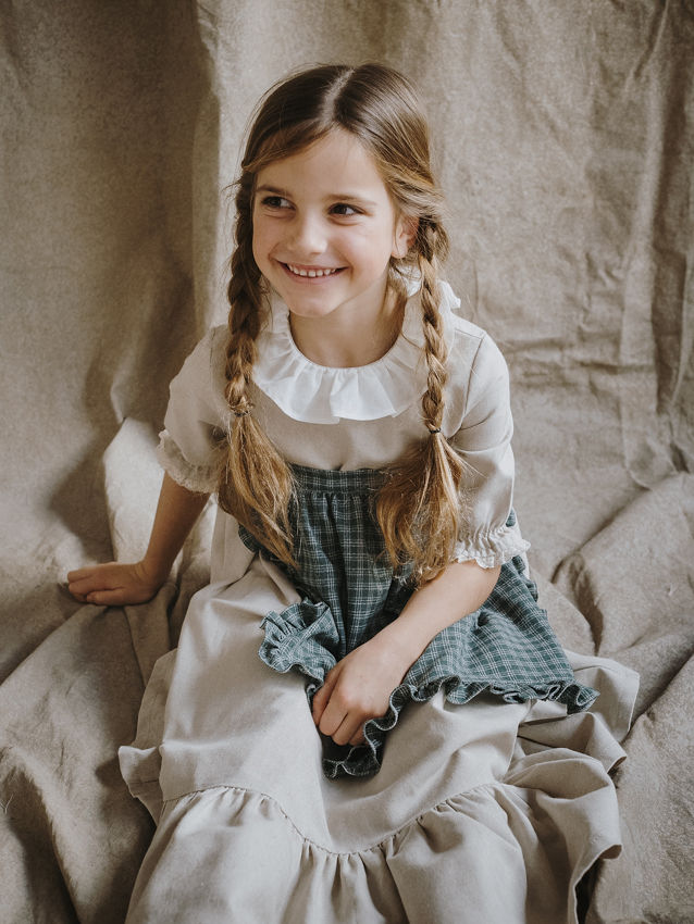3.5 VESTIDO CARLOTA CORTO M/F COTTON TOSTADO CON DELANTAL VOLANTITO ESCOCÉS PV